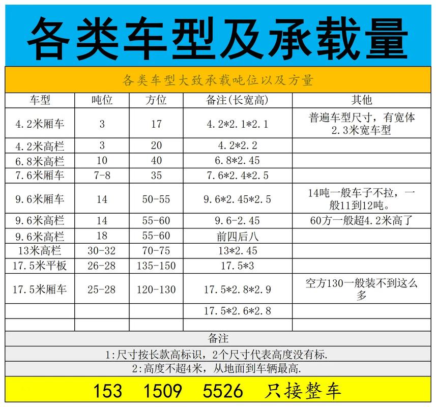 一般講相同噸位的車,車廂尺寸不一定相同,但一般大貨車寬度2.3-2.4米,最少2.3米寬.長度一般在8米-10米甚至12.5米.如果不是廂式車貨物頂部高度一般離地4.2米,最高4.5米 。
